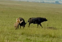 It was the lions there were to provide the best wildlife experience of the day. We spotted a couple of jeeps off-road, normally an indication of something worth seeing. We picked up on the site of two ears, a lioness, stocking through the grass. We pulled up alongside two other jeeps, as we did two other lionesses appeared, they had surrounded two buffalo, as one leapt forward the buffalo bolted and a chase between predator and prey commenced. The jeeps pulled out as the lions accelerated to catch their pray, two lions on either side and one coming up the middle. One caught up and launched itself onto the rear hide of the wildebeest, an ear piercing screech erupting from the poor beast but for the lioness alas it wasn’t enough, too light it didn’t have the force to break the beasts back and too young to realise it’s the neck, not the rump that they need for a kill of a creature that large. The buffalo escaped and ran off. The lions, exhausted, slunk along the road towards the trucks, no doubt welcoming the shade they afforded. Stopping to sip at a river, it was evident there was frustration from the loss of a kill. Panting they pulled up and stopped at the first jeep, one of ours, two collapsing in front of the vehicle and one behind the front tyre. An incredible view for our group, and equally so for those behind who sat and watched as they recovered from their failed hunt. An exceptional moment, like something from a David Attenborough documentary. Not something easily forgotten and we were incredibly lucky to have seen.